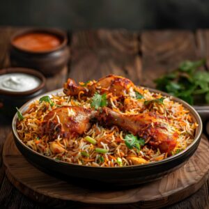 Marinate and fry chicken pieces, then layer them with cooked rice, spices, and herbs, and dum-cook for a smoky, robust flavor.