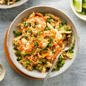 Prawns marinated and stir fried cooked with rice, vegetables and mixture spices in soy sauce
