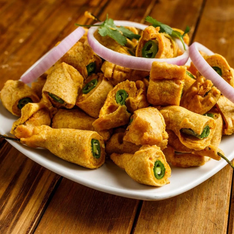 Nutty tangy flavoured green chillies dipped in batter and deep fried.